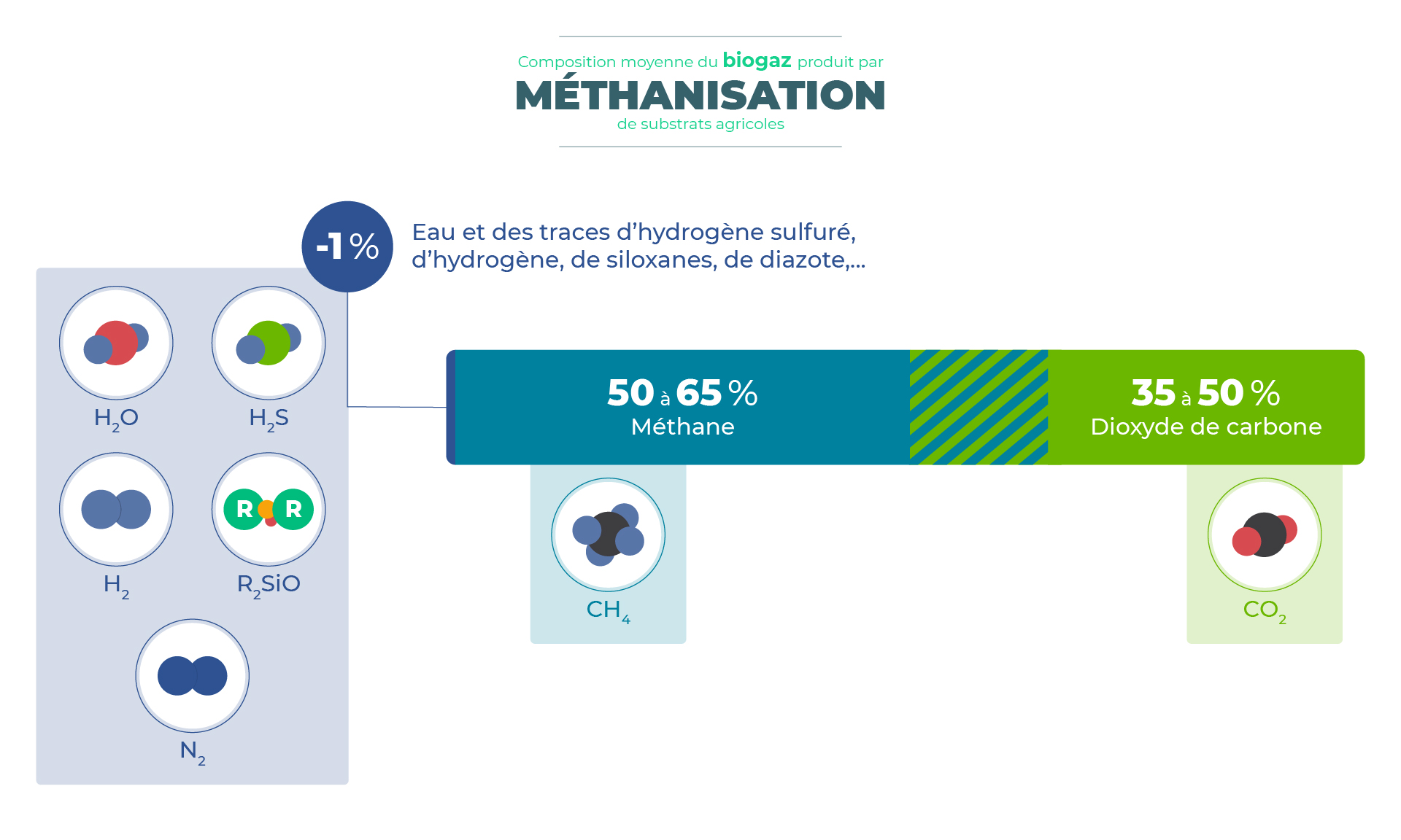 Le biogaz est un des produits de la méthanisation avec le digestat. C'est un gaz qui contient principalement du méthane combustible (CH4) et du dioxyde de carbone (CO2). On peut l'employer de différentes façons.